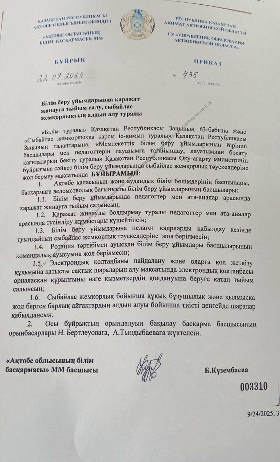 Білім беру ұйымдарында қаражат жинауға тыйым салу туралы бұйрық